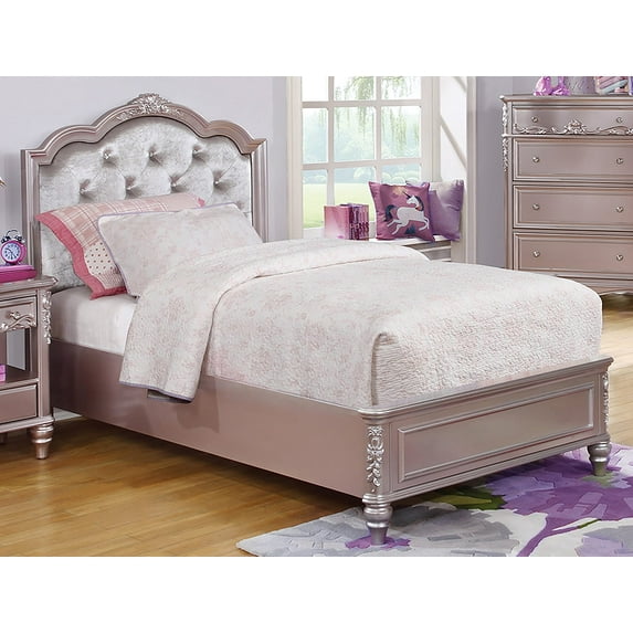 Designed with a whimsical style fit for fairytale royalty, this full-size bed from the Caroline Collection is worthy of becoming an instant focal point in any room. The metallic lilac finish glimmers in the light, with sparkles of rhinestone peeking out from the deep tufting of the upholstered headboard. In the base, a wide drawer offers plenty of storage room for items like luxurious comforters or extra linens.