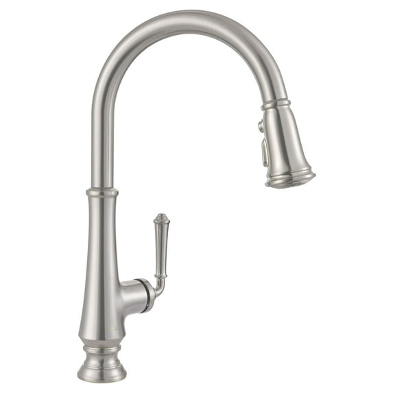 The Delancey Pull-down kitchen faucet from American Standard features a time-honored traditional design that fits in perfectly in a traditionally styled kitchen. A three- function pull-down sprayer features a stream, spray and pause feature that helps tackle a variety of kitchen tasks with ease. A durable brass spout and metal body and lever handle provide long-lasting use to withstand day-to-day chores. A flow rate of 1.5 gallons per minute helps to save water, without sacrificing on performance.