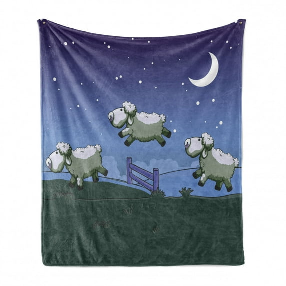 Hero image 0 of Cartoon Soft Flannel Fleece Throw Blanket, Counting Sheep to Sleep Fluffy Farm Animals over the Fence, Cozy Plush for Indoor and Outdoor Use, 70" x 90", Dark Indigo Hunter Green, by Ambesonne, 0 of 5