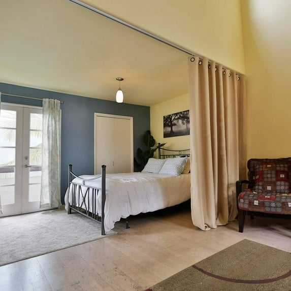Detailed installation instructions come with each kit, Premium Heavyweight Room Divider Curtains significantly reduce light and create the ultimate form of privacy, Size "X-Large" Kits come with 40 roller hooks, The ceiling track is 1 3/8in wide in diameter, strong (all aluminum), fits flush to the ceiling, and requires a simple setup, Our heavyweight room divider curtains are made from 100% polyester that looks elegant and complimentary in all settings, Please Note: The tracks can easily be lined up and combined together on the ceiling to reach larger distances., Dividers contain 1 3/4in metal grommet rings