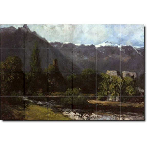 Ceramic Tile Mural-Gustave Courbet Country Painting 158. 48" w x 32" h using (24) 8 x 8 ceramic tilesCeramic Tile Mural Gustave Courbet Country Painting 158 48 w x 32 h using 24 8 x 8 ceramic tilesCeramic Tile Mural Gustave Courbet Country Painting 158 36 w x 24 h using 24 6 x 6 ceramic tilesCeramic Tile Mural Gustave Courbet Country Painting 158 25 5 w x 17 h using 24 4 25 x 4 25 ceramic tiles