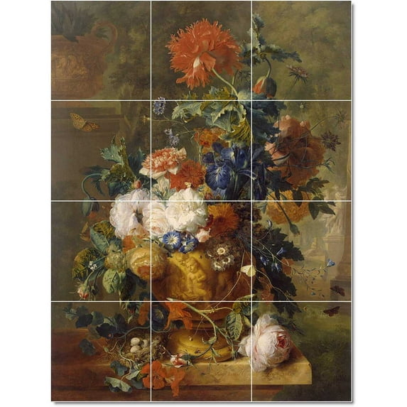 Ceramic Tile Mural-Jan van Huysum Flowers Painting 162. 24" w x 32" h using (12) 8 x 8 ceramic tilesCeramic Tile Mural Jan van Huysum Flowers Painting 162 24 w x 32 h using 12 8 x 8 ceramic tilesCeramic Tile Mural Jan van Huysum Flowers Painting 162 36 w x 48 h using 12 12 x 12 ceramic tiles
