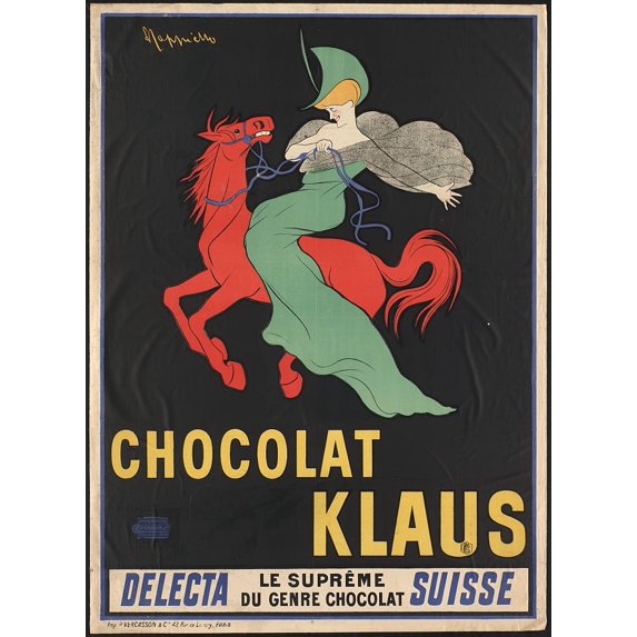 Advertisement poster showing a woman in a green dress astride a galloping red horse. The image remained a logo for the Swiss chocolate company for fifty years.