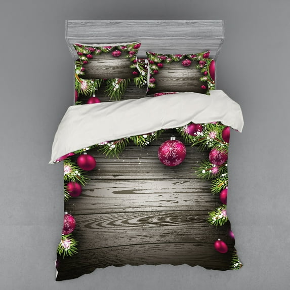 Christmas Duvet Cover Set, Old Fashioned Concept with Twigs and Balls on Rustic Wood Vintage Design Print, Bedding Set with Shams and Fitted Sheet, 3 Sizes, by AmbesonneChristmas Duvet Cover Set Old Fashioned Concept Twigs Balls Rustic Wood Vintage Design Print Bedding Set Shams Fitted Sheet 3 Sizes AmbesonneAmbesonne Christmas Bedding Set 3 Pcs Rustic Balls Branch Twin XL Brown PinkAmbesonne Christmas Bedding Set 3 Pcs Rustic Balls Branch Twin Brown Pink