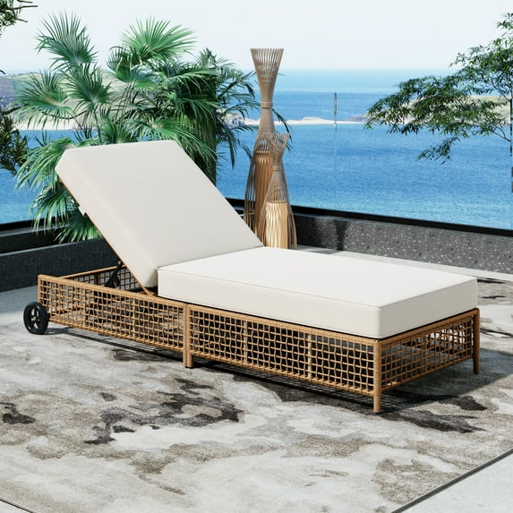Hero image 0 of Harper & Bright Designs Rattan Outdoor Lounge Chaise with Wheels, Patio Recliner with 5 Position Adjustable Backrest and Removable Cushions, All Weather Pool Lounge for Garden, Natural+Beige, 0 of 17