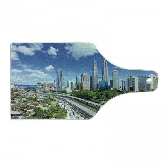Hero image 0 of City Cutting Board, Kuala Lumpur Skyline in a Clear Day Financial District Highway Skyscrapers, Tempered Glass Cutting and Serving Board, Wine Bottle Shape, Pale Grey Blue Green, by Ambesonne, 0 of 1