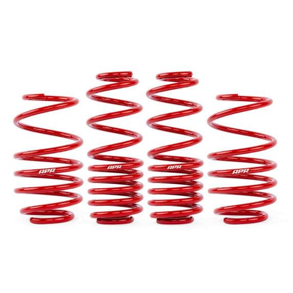 Compatible with Volkswagen® GTI MK7 / MK7.5 models. These Lowering Springs are not created ro sold by Volkswagen®. Sold as a Set.;APR Roll-Control Lowering Springs greatly improve the looks and handling of your Volkswagen® MK7 / MK7.5 GTI without greatly sacrificing comfort or your wallet! Designed for use with DCC or Non-DCC dampers, our performance lowering springs are a direct plug-and-play upgrade that offer a lower center of gravity and increased spring rates to reduce body roll. Many lowering springs on the market today simply lower your vehicle and give a false sense of improvement by feeling overly stiff. We took a different approach with our design. We extensively track and street tested several iterations to deliver a system that not only makes your GTI look great, but does so while delivering a comfortable experience that doesn't constantly compress and ride on the bump stops or crash and bottom out the dampers. Through a proper ride height configuration, we're able to greatly increase spring rates for improved handling, but do so without leaving the ride harsh, bouncy, and uncomfortable. Your GTI will be planted with a minimal impact on comfort. It's a system you'll love the second you're behind the wheel! These springs were designed in house and manufactured in theusing a premium high tensile chrome silicon steel for excellent resilience against sagging and failure for years to come. Each spring comes powder coated in our signature red color, further protecting the spring from the elements. The front and rear springs are a dual rate spring that will operate as a single rate, linear spring, under normal loaded driving situations. All center of wheel to fender (CF) measurements were recorded on our in-house US Spec 2017 MK7 GTI (Non-DCC) and US Spec 2018 MK7.5 GTI (DCC) test vehicles and may vary slightly from vehicle to vehicle. Lastly, while this system was designed specifically for the MK7 / MK7.5 GTI, it will fit other similar platform vehicles.;