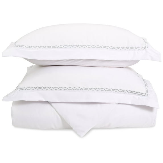 Sleep peacefully with the Augus Embroidered Trim Wrinkle-Resistant Duvet Cover Set. This plush bundle is beautifully designed with a premium, 100% Brushed Microfiber construction that provides sweet dreams night-after-night. Each set includes 1 duvet cover with a clear, hidden button closure, and 2 matching pillow shams (1 sham is included with Twin/Twin XL sizes). This charming trio is available in an array of solid colors with a geometric, quatrefoil embroidered trim on the pillow shams and boasts a subtle shimmer from its sateen weave finish that makes the decorating options endless. Transform your bedroom into a serene retreat by adding matching sheets or extra pillowcases, sold separately.