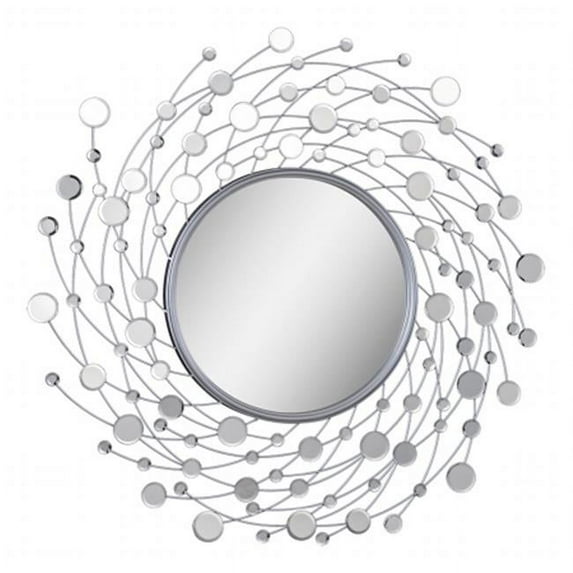 Over a hundred small beveled circular mirrors create a spinning web around a polished center mirror creating a perfectly lavish, whimsical feel.