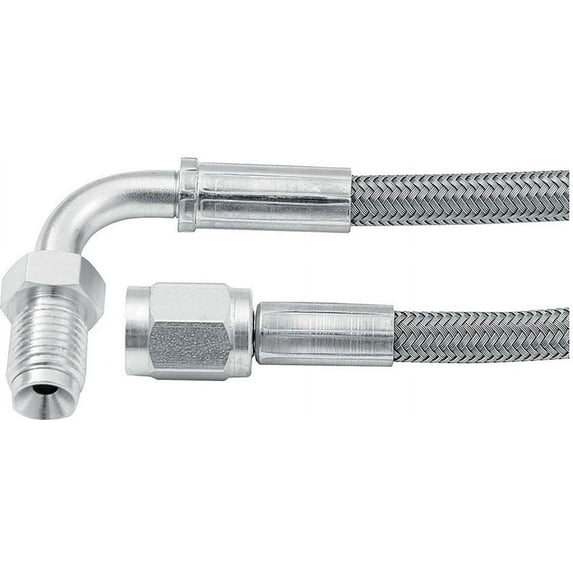 Allstar offers a wide selection of braided steel lines in various lengths. All lines come with one straight end and your choice of straight, 45° or 90° on the other end. The inner PTFE hose is compatible with all brake fluids. The braided stainless steel outer covering resists abrasion and corrosion. Ideal for use where bending and flexing occur. More durable than rubber hose. Lengths stated are overall end to end including fittings.;