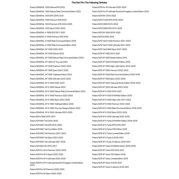 | Vehicle year | 2022Tusk Front Aluminum Wheel Spacers 38mm For POLARIS RZR XP 1000 Premium 2022 | 2015Tusk Front Aluminum Wheel Spacers 38mm For POLARIS RZR XP 1000 High Lifter Edition 2015-2022 | 2022Tusk Front Aluminum Wheel Spacers 38mm For POLARIS RZR Pro XP Ultimate Rockford Fosgate Limited Edition 2022 | 2020Tusk Front Aluminum Wheel Spacers 38mm For POLARIS RZR 900 Trail Fox Edition 2020 | -Tusk Rear Aluminum Wheel Spacers 30 mm For Polaris RZR 570 2012-2021 | -Tusk Wheel Bearing Greaser Front | -Tusk Wheel Bearing Greaser Front | -Tusk Wheel Bearing Greaser Front | -Tusk Wheel Bearing Greaser Front | -Front Aluminum Wheel Spacers 38mm for Polaris RANGER RZR S 900 2015-2018 |