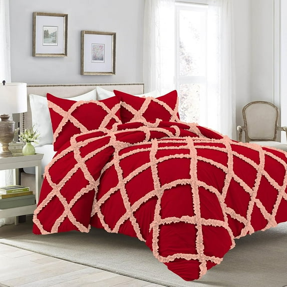 Hero image 0 of 1 Piece Luxury Two Tone Diamond Ruffle Pattern Comforter Super Soft, All Season 800 Thread Count, 100% Egyptian Cotton, Oversized Super King Size Peach/Red Solid Color, 0 of 4