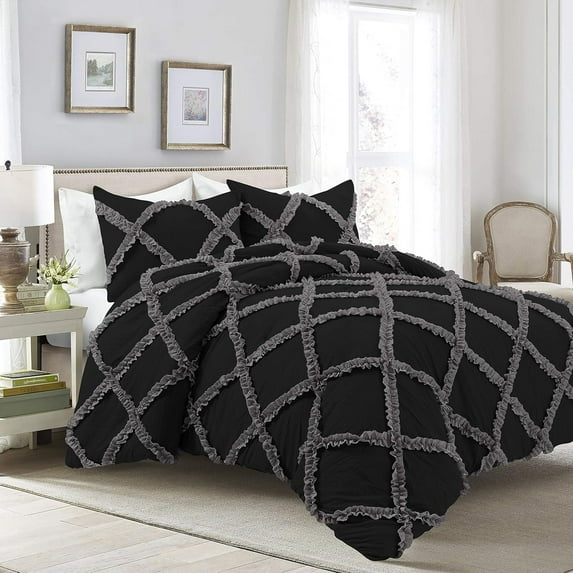 1 Piece Luxury Two Tone Diamond Ruffle Pattern Comforter Super Soft All Season 800 Thread Count, 100% Egyptian Cotton, Twin/Twin XL Size Dark Grey/Black Solid Color