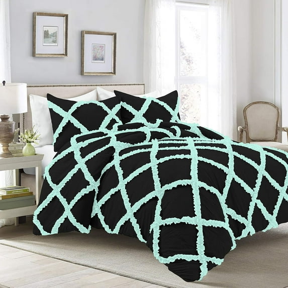 Hero image 0 of D.N.G. BEDDINGS 3 Piece Luxury Two Tone Diamond Ruffle Pattern Comforter Set Premium Super Soft All Season 800 Thread Count, 100% Egyptian Cotton, Super King Size Aqua Blue/Black Solid Color, 0 of 4