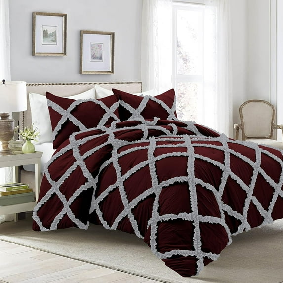 Hero image 0 of D.N.G. BEDDINGS 3 Piece Luxury Two Tone Diamond Ruffle Pattern Comforter Set Premium Super Soft, All Season 800 Thread Count, 100% Egyptian Cotton, Twin/Twin XL Size Wine-Silver Color, 0 of 4