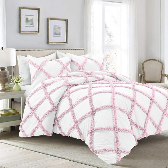 Hero image 0 of D.N.G. BEDDINGS 5 Piece Luxury Two Tone Diamond Ruffle Pattern Comforter Set Premium Super Soft, All Season 800 Thread Count 100% Egyptian Cotton Super King Size Light Pink/White Solid Color, 0 of 4