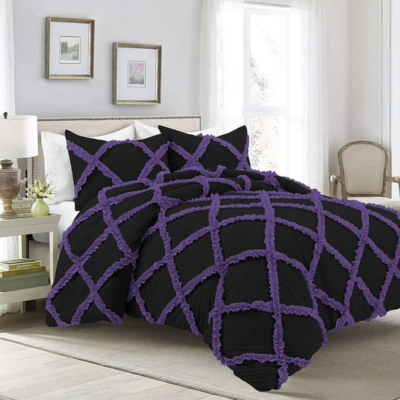 Hero image 0 of D.N.G. BEDDINGS 5 Piece Luxury Two Tone Diamond Ruffle Pattern Comforter Set Premium Super Soft All Season 800 Thread Count, 100% Egyptian Cotton, Twin/Twin XL Size Purple/Black Solid Color, 0 of 4