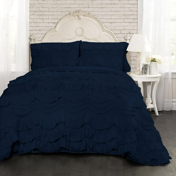 Hero image 0 of D.N.G. BEDDINGS 800 Thread Counts, 100% Egyptian Cotton, 550 GSM Microfiber filled Quilt Ruffled With Small Pom Pom Textured 1 Piece King/Cal-King Size Comforter, Navy, 0 of 6