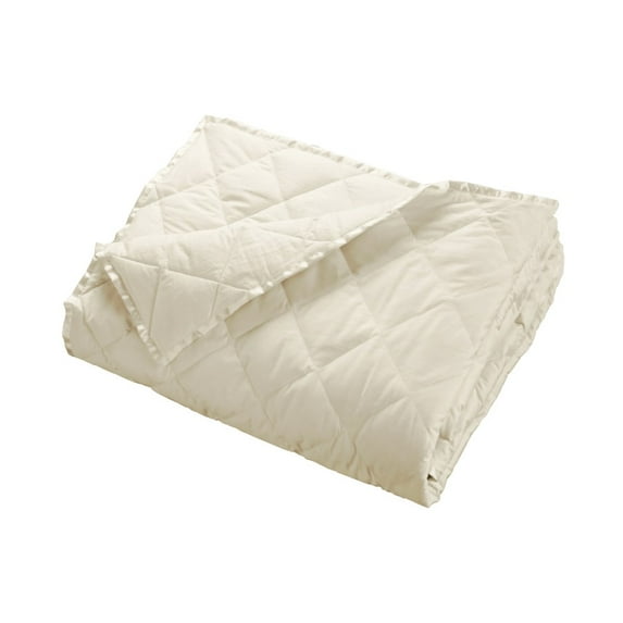 This lightweight down blanket adds an upscale touch to any bedroom. The 550 fill power white duck down provides lightweight warmth perfect for use alone in the summer or in addition to something heavier in the cooler months. 230 cambric cotton is one of the most down -proof fabrics, so your down will stay in the comforter with minimal leaking through the years. Sewn -thru construction not only adds the classic quilted look to this blanket but also compartmentalizes the down, ensuring that it won't shift and leave you with cold spots. Details: Available in White or Ivory1 Inch Satin Trim Detail Sold Individually Easy Care: Machine Washable & Dryable Made in China for DOWNLIT Sizes & Weights: Oversized Queen - 94 x 104 Inches - 16 oz. Oversized King - 113 x 104 Inches - 20 oz.