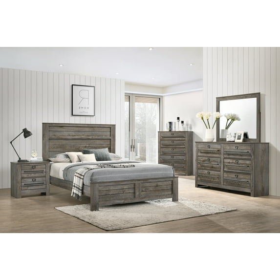 15 out of 5 Stars. 1 reviewsShipping, arrives in 3+ daysRoundhill Furniture living room Floren Contemporary Weathered Gray Wood Bedroom Set, King Panel Bed, Dresser, Mirror, Two Nightstands, Chest $1,799.99