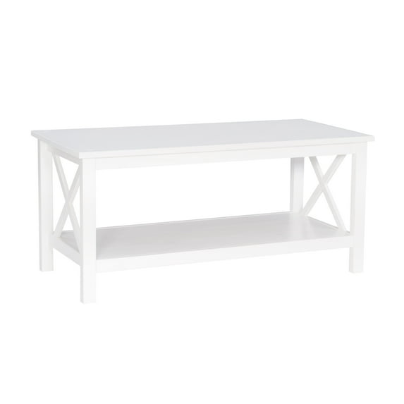 This sturdy coffee table makes itself at home in living rooms of all shapes and styles. A welcoming and versatile centerpiece, you can use its wide, smooth surface to showcase your favorite display items or serve trays of food when guests come over. The large lower shelf offers extra storage, and the crisscross sides add interest to this modern farmhouse piece. It is crafted from solid pine with an antique white finish that allows the beauty of the wood grain to show through. It also works perfectly as a media stand holding a TV, plus ample space below.
