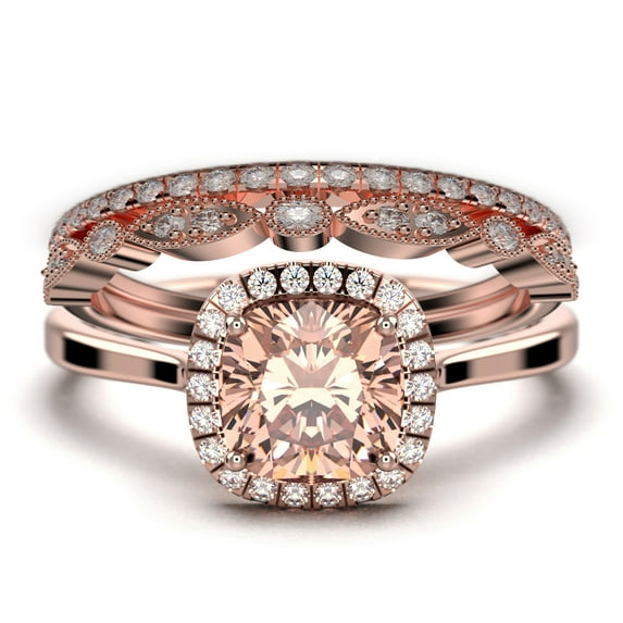 Hero image 0 of Dazzling Halo 2.55 Carat Cushion Morganite And Diamond Moissanite Engagement Ring, Wedding Ring, Two Matching Band in 925 Sterling Silver With Plain 18k Rose Gold Plating Shank Gift For Her, Trio Set, 0 of 4