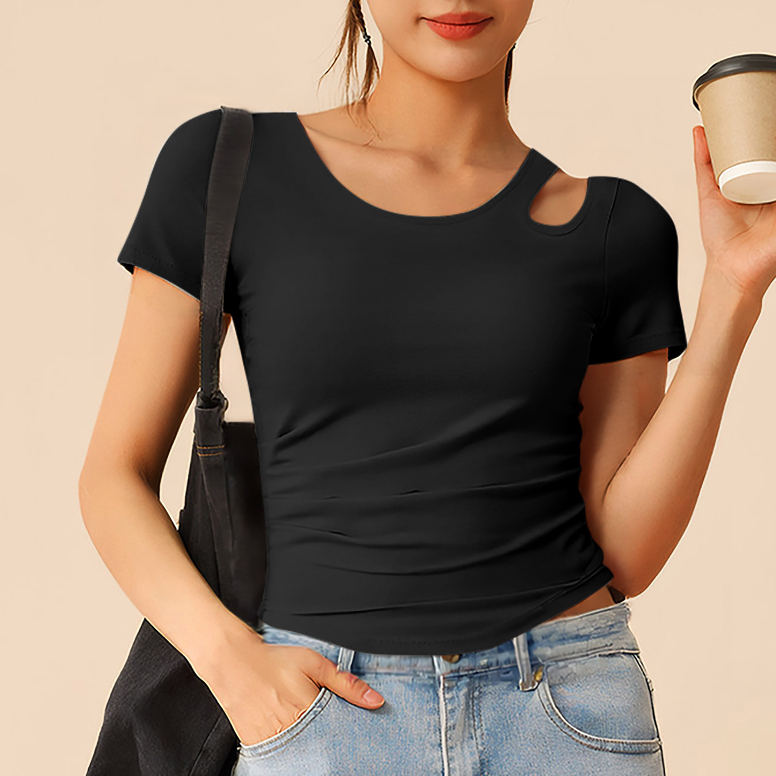 Stylish Olyvenn Womens Fashion Yoga T-Shirts Cropped Short Sleeve Crewneck Cut Out Tops Athletic Workout Trendy Y2k Clothes Black S