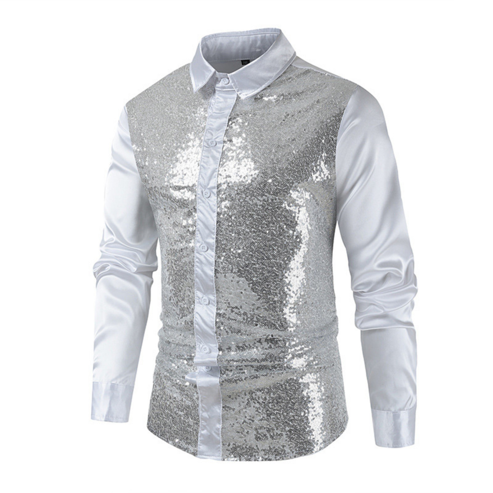 Hero image 0 of Fashion YLSDY Men's Shiny Metallic Sequin Long Sleeve Button Down Shirts for Halloween Cosplay Party Trendy Performance Costume Sequin Shirt White XXL, 0 of 7