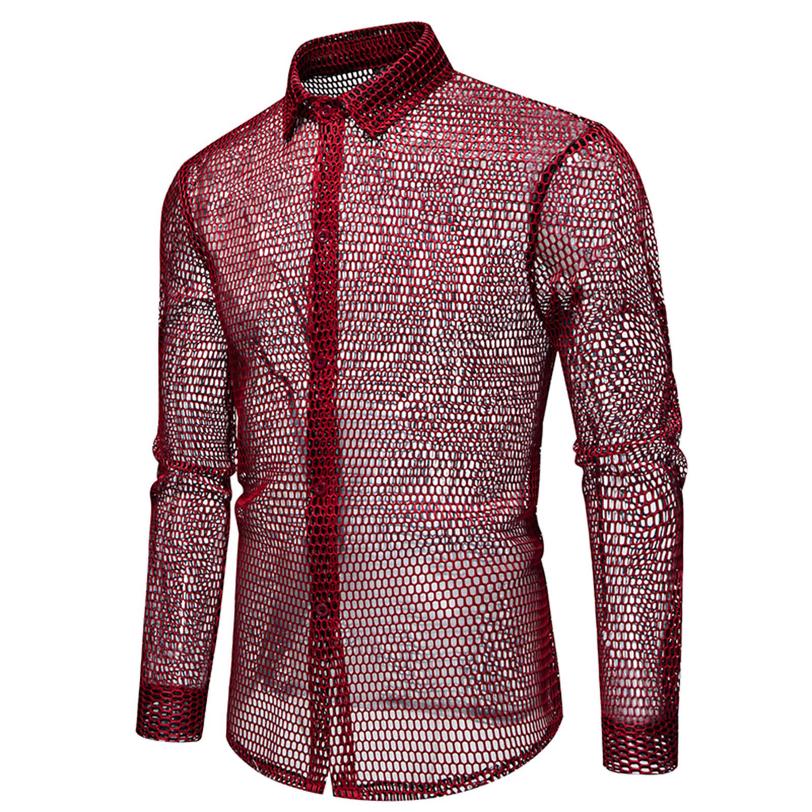 Hero image 0 of Fashion YLSDY Mens Fishnet See Through Shirts Casual Long Sleeve Button Down Collared Hollow Out Sheer Shirts Party Night Club Wear Red XL, 0 of 9