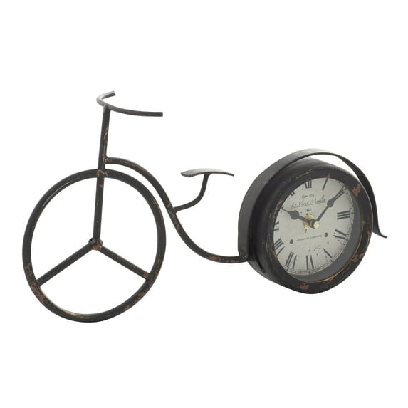DecMode 8" Black Metal Bike Clock is a unique addition to your stylish home. Improve your time management skills and keep a clock close by with this charming piece. A dashing display on any surface to help you manage your time throughout the day. Rustic, farmhouse, and vintage-themed homes or offices make the best settings. Requires 1 AA battery. Battery not included. This item ships in 1 carton. Roman numbers are in black, with hash marks, on a white face. The clock mechanism runs silent. Metal clock makes a great gift for any occasion. Suitable for indoor use only. This item ships fully assembled in one piece. Farmhouse style.