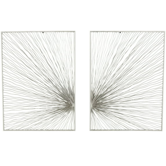 DecMode Silver Metal Coiled Ribbon Sunburst Wall Decor (2 Count) is a unique addition to your stylish home. Perfect for any living room, bedroom, or office, this sunburst set of 2 wall sculptures creates a stunning focal point. This item ships in 1 carton. Can be hung vertically using the sawtooths; nails and screws not included. Suitable for indoor use only. This item ships fully assembled in one piece. This silver colored metal wall sculptures comes as a set of 2. Glam style.