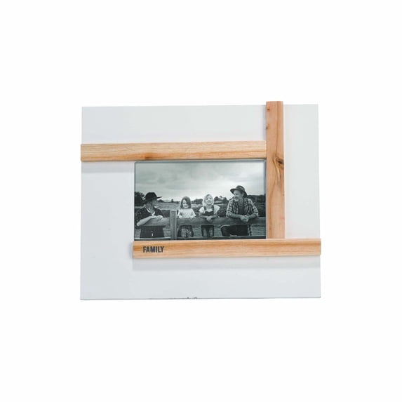 Style: The wood picture frame features a sleek white and natural pieced wood finish with a lovely "Our Family" sentiment and holds a 6 x 4 photo.