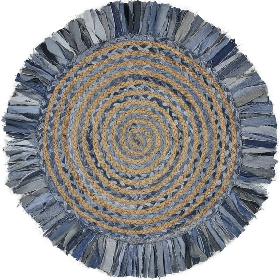 - Artisan Craftsmanship: Handmade by expert artisans, this rug features alternating braids of denim blue cotton and natural jute fibers, complemented by thick edge fringe, adding a playful and eye-catching foundation to any space.