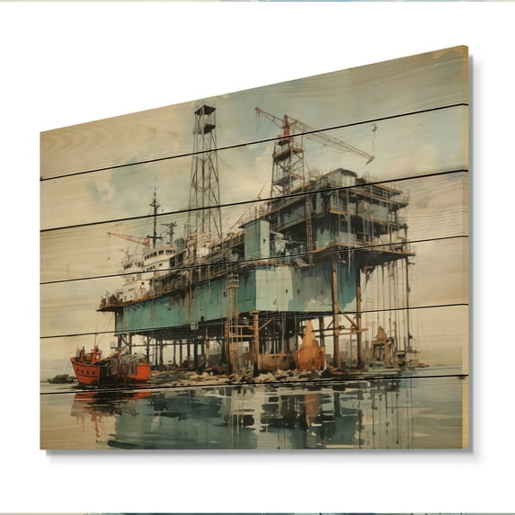 Designart "Blue Oil Rigs landscapes Industrial III" Oil Rigs / Fields Print on Natural Pine Wood