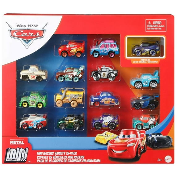 Speed off on Disney and Pixar Cars adventures with this 15-pack of mini character vehicles. Each features a metal body, rolling wheels and iconic details. This big variety set creates an instant collection, and the cars' compact size and authentic features are perfect for movie play at home and on the go! Choose the whole assortment of Minis for even more action and laughs! Each multi-pack of mini cars sold separately, subject to availability. Colors and decorations may vary.