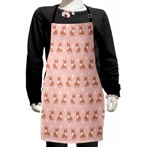 Hero image 0 of Dog Lover Kids Apron, Little Corgi Jumping Running and Standing Cartoon Hearts Background, Boys Girls Apron Bib with Adjustable Ties for Cooking Baking Painting, Coral Orange White, by Ambesonne, 0 of 2