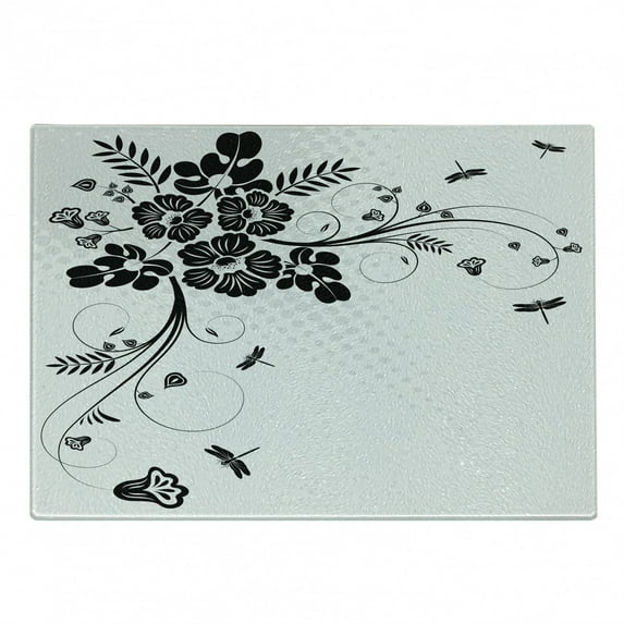 Hero image 0 of Dragonfly Cutting Board, Floral Ornament with Fern Plants Leaves Nature Themed Illustration, Decorative Tempered Glass Cutting and Serving Board, Small Size, Black White, by Ambesonne, 0 of 1