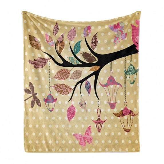 Hero image 0 of Dragonfly Soft Flannel Fleece Throw Blanket, Tree Branch with Original Lantern and Leaves on Polka Dots Backdrop Ethnic, Cozy Plush for Indoor and Outdoor Use, 70" x 90", Multicolor, by Ambesonne, 0 of 6