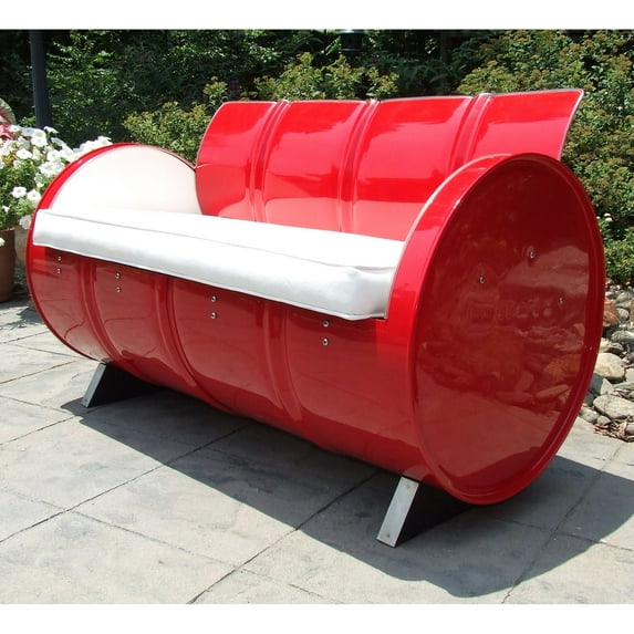 Add some green furniture to your life. We recycle and repurpose used steel drums into striking designs. You'll love the fact that we use what industry has already produced and turn it into sturdy and unique furnishings for your home or office. Our products showcase the repurposing movement as a whole, and promote the benefits of using low VOC finishes such as powder coating technology. Our products use; CNC cut components, top grade fasteners and pressure treated wood materials, and are MIG welded for strength and durability. The powder coated finishes of the recycled 55 gallon steel drums are bright and rust resistant. These are real recycled drums, with little dings and dents from years of industrial use, that are sourced from an industrial supplier that cleans and prepares them for repurposed life as furniture. After the drums are transformed into seating designs here at Drum Works Furniture, they are baked at 500 F and then sandblasted and powder coated, the natural curve of the drum is the near optimum match to the natural curve of the back. The SS 396 love seat (40 inch wide seating area) easily seats two to 3 adults. Like all of our seating, they are finished on the inside and the cushions are removable to reveal hidden storage. It is upholstered with Nautolex cloud white marine grade vinyl and powder coated in bengal red.