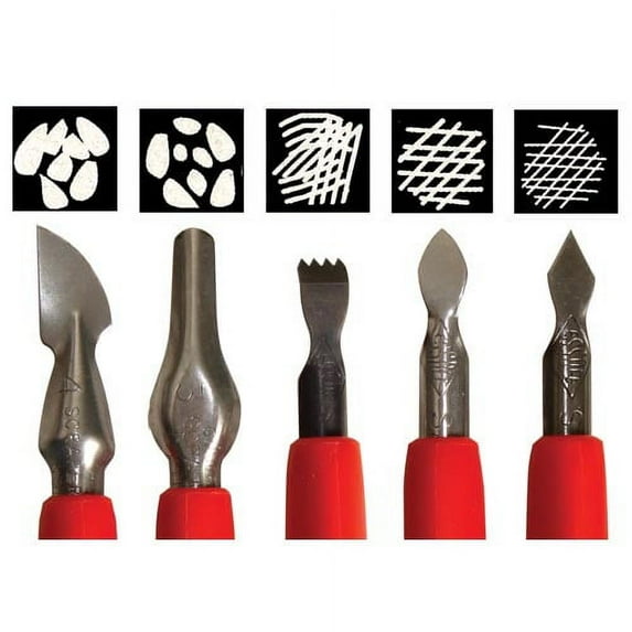 Make circles, patterns, cuts, lines, shapes, dots, textures and cross-hatching with ease! Set includes five different cutters for creating lines and textures on scratchboard and paper. Also contains five durable plastic handles.