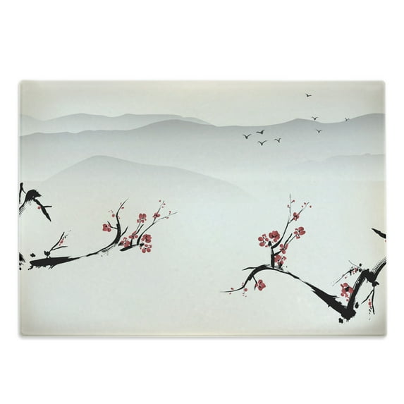 Hero image 0 of East Cutting Board, Japanese Nature Landscape National Sakura Flower over Himalayas and Flying Gulls, Decorative Tempered Glass Cutting and Serving Board, Large Size, Beige Red Black, by Ambesonne, 0 of 1