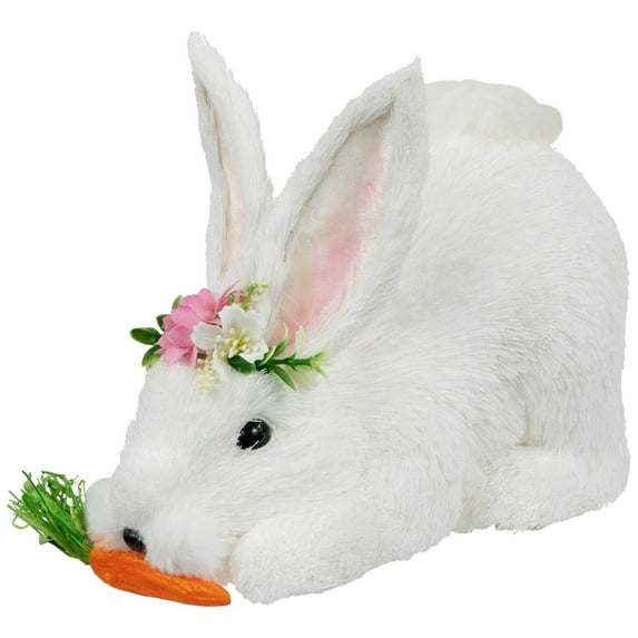 Capturing the whimsy of Easter this charming rabbit figurine will add a touch of joy to your seasonal decor. This adorable bunny holds a carrot in its mouth exuding a playful charm. Adorned with a delightful floral crown on its head this whimsical decoration adds a touch of Easter cheer to your home.