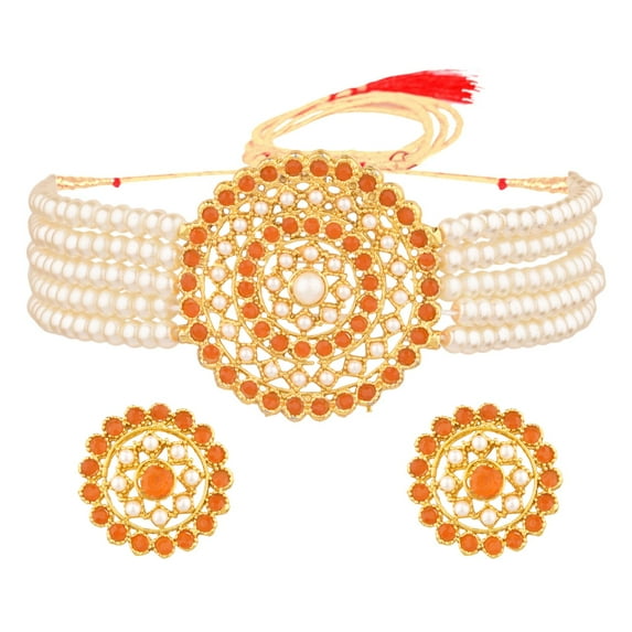 Traditional, vintage, boho, ethnic, elegant statement choker necklace earrings fashion novelty wedding bridal jewellery accessories for women, ladies and girls. Delicate eye catching classic unique exotic jwellery. Handmade, multilayered, stranded, embellished with faux pearls, beads, crystals and rhinestones. Easy to wear using an secure closure for perfect fit. Skin Friendly, environmental friendly. Durablility with the look of fine premium quality jewellery. Wear this with your gorgeous traditional dress, saree, lehenga, gown on any wedding, party, engagement, ring ceremony, prom, anniversary or any festive or special occasion. This simple look piece go with everything in your closet from ethnic to casual wear or festival or any other occasion. Perfect Gift For Any Occasion for yourself or your loved ones, GIFT FOR HER! Ideal Valentine's, Birthday, Anniversary gift for wife or girl friend .