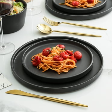 - 2 out of 5 stars review3/24/2020Slightly DisappointedI was excited to come across a black dinnerware set that had a little flavor to it with geometric design. Upon arrival 2 plates were chipped and 1 mug handle broke. Which wasn't the most frustrating thing, the plates lack any depth. They're almost completely flat, like the food will show right off the edge. They're also very rough. When I saw glazed, I was expecting a smoother surface but you can feel numerous bubbles and flaws in the craftsmanship. I guess you get what you pay for but was expecting a little more.Marie