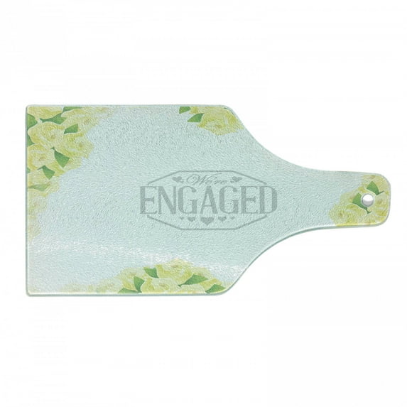 Engagement Party Cutting Board, We Are Engaged Announcement with Roses and Leaves Celebration Print, Tempered Glass Cutting and Serving Board, Wine Bottle Shape, Yellow and Green, by AmbesonneEngagement Party Cutting Board We Are Engaged Announcement Roses Leaves Celebration Print Tempered Glass Serving Wine Bottle Shape Yellow Green AmbesEngagement Party Cutting Board We Are Engaged Announcement Roses Leaves Celebration Print Decorative Tempered Glass Serving Small Size Yellow Green AEngagement Party Cutting Board We Are Engaged Announcement Roses Leaves Celebration Print Decorative Tempered Glass Serving Large Size Yellow Green A