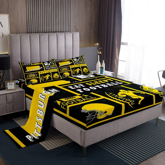 Erosebridal Sports Bed Sheets Set for Football Fan,Football Sheet Set Full,Rugby Sheets,Ball Patchwork Flat Fitted Sheet with 2 Pillowcases Deep Pockets(Pittsburgh)