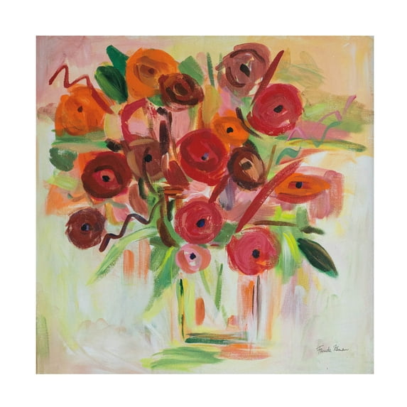 Artist: Farida ZamanSubject: FloralStyle: Modern & ContemporaryProduct Type: Gallery-Wrapped Canvas Art This ready to hang, gallery-wrapped art piece features a painterly depiction of a bouquet of flowers in a vase. Prominent Colors: White, Pink, Tan, Red, Wine Farida Zamans passion for art and design led her to an international career as a freelance illustrator and fine artist in Geneva, London, New York and Toronto. Her unmistakably lively, colorful and whimsical art can be seen in posters, book covers, children’s book illustrations, clothing, packaging and giftware. Gaining inspiration in recent years from trips to Morocco, Thailand, Turkey, Iran, Italy, Spain and France, her travels have added a sophisticated and multi-cultural flair to her collections. Giclee (jee-clay) is an advanced printmaking process for creating high quality fine art reproductions. The attainable excellence that Giclee printmaking affords makes the reproduction virtually indistinguishable from the original piece. The result is wide acceptance of Giclee by galleries, museums, and private collectors. Gallery wrap is a method of stretching an artist's canvas so that the canvas wraps around the sides and is secured a hidden, wooden frame. This method of stretching and preparing a canvas allows for a frameless presentation of the finished painting. Whether it's a contemporary, rustic, modern, or traditional style decor, Trademark Fine Art offers a variety of high-quality, carefully built wall art that will surely complement any style. We provide an abundance of art themes that range from fascinating abstracts to breathtaking landscapes. With an assortment of sizes and styles such as Framed, Matted Framed, Panel, Aluminum, Wood Canvas or other mediums, our art will certainly bring excitement to any area of your home. From the bedroom, to the living room, or even the office, Trademark Fine Art makes professionally handcrafted, ready to hang wall decor that will be admired for years to come!IMPORTANT: Avoid buying counterfeit products and transacting with unauthorized sellers. Look for our logo on the packaging for every one of our products. Trademark Fine Art is committed to providing the consumer with the absolute best price and value on our entire line of products, which we ensure by applying a rigorous Quality Control process. Trademark Fine Art is a registered trademark protected by . Trademark law and will be vigorously defended.