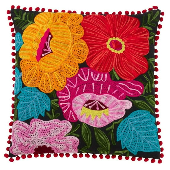 Fennco Styles Bold Floral Embroidery Pom Pom Trim 100% Cotton Decorative Throw Pillow, Multi Floral