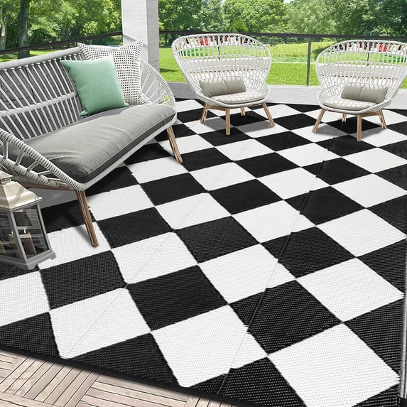 Shipping, arrives in 3+ daysWaterproof Outdoor Rug 6x9 ft, Reversible Mats, Modern Outdoor Area Rug, Large Floor Mat and Rug for Outdoors, RV, Patio, Backyard, Deck, Picnic, Beach, Trailer, Camping, Black & White Lattice $26.90