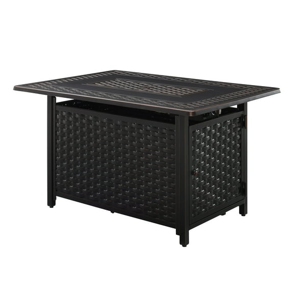 Upgrade your outdoor space with the Fire Sense Albany Rectangle Aluminum Propane Fire Pit. It features an intricate basket-weave tabletop and an antique bronze finish that complements both classic and contemporary outdoor settings. This versatile fire pit is made of durable aluminum and provides an adjustable full-flame output of 45,000 BTU. When covered with the included fire bowl lid, it doubles as a practical patio table. The package includes clear fire glass droplets for added sparkle, and you can easily connect a standard 20 lb propane tank behind the hinged door. Additionally, a nylon cover is included for your convenience.